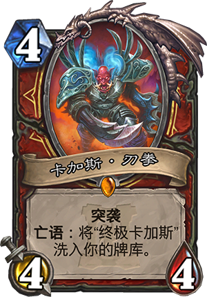 终极随从一开始会是很强的前中期传说随从,他们可以很好地站场并完成自己的使命,在战斗中英勇牺牲。但当他们的亡语触发时,他们会化身为强大的升级版本(有些甚至可以说是超模版本),然后再次进入你的牌库。原本的九个职业也会各自有1位终极随从,例如传说级战士随从[卡加斯·刃拳]。这个随从的初始形态为法力消耗值4点的4/4,并具有突袭的随从,但他升级之后就会变为 [终极卡加斯],法力消耗值8点的10/10并具有突袭的随从,并且每次消灭一个敌方随从都会为你提供10点护甲值。