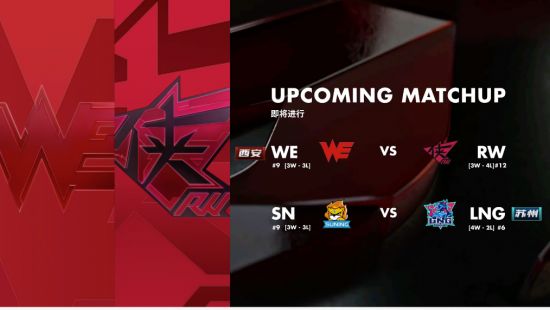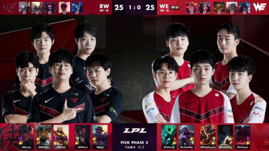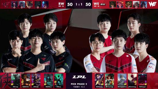 第四周第二日的比赛于17:00正式开始,首场比赛由WE对阵RW。本赛季WE在经过人员更换后取得了不错的成绩,目前三胜三负,排名第九位;而RW显然还没有找回去年的状态,三胜四负,居第九位。在上周的比赛中,WE选择更换中单Plex为TeacherMa后,赢下了比赛胜利;RW的首发阵容不变。