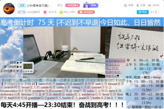 “24h共享自习室”、“18h高考自习室”便是其中的缩影。不管是凌晨1点,还是早上7点,学生们都在认真埋头学习。“行者方致远,奋斗路正长”作为直播间的座右铭挂在直播页面正上方,而直播界面右侧则是相互鼓励、问好、交流学习进度的互动留言版,数万名“云同桌”同时在线督促学习。