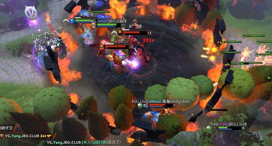 BO5第二把,VG放了凤凰马尔斯,LGD当仁不让,直接点出了这两个英雄。另一边,VG则是选出了虚空、电魂和人马,双酱油是火女和萨尔。后几手,LGD拿出了Maybe的女王、查理斯的龙骑士和Xnova的蓝胖子。开局一分半,LGD就在下路拿下了一血。四分钟的符点团战,Fy戏耍Dy,Maybe收下萨尔的人头。不过在一分半后,LGD却因为冲塔杀人付出了惨痛的代价——女王拼了电魂,但自己也被火女收掉,Fy的凤凰也一并白给。七分半,查理斯被皮鞋踩中,龙骑士不慎阵亡。不过在9分钟,LGD组织了一波四人包下,VG二人组相机倒下。