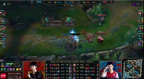 首局比赛LNG圣枪哥招牌杂技,上单琪亚娜,中野奥拉夫妖姬,前期主动权拉满,FPX这边选了飞机厄斐琉斯双射手后期体系。双方前期平稳发育,Tian拿下第一条小龙和先锋,9分钟30秒Doinb飞机骑脸妖姬,被奥拉夫逮个正着,送出一血。随后双方多次交手,LNG取得了人头6比3的领先。20分钟,LNG直接想要动大龙,被FPX阻止。随后FPX决策完美,利用剑魔的拉扯加上牺牲一条小龙的代价,拿到了大龙。28分钟LNG中路抓住机会5打4,击杀FPX三人后直接拿下水龙魂和大龙,接连推掉FPX上中两路高地。35分钟LNG中路强推失败,飞机加厄斐琉斯爆炸AOE击杀LNG四人后拿下远古龙和大龙。FPX直接反攻一波LNG无法抵挡,基地被拆,FPX拿下第一局比赛胜利。