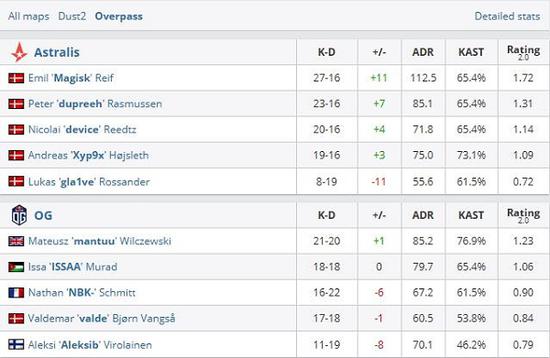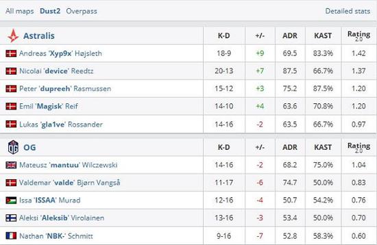 图二来到Astralis自己选择的Overpass,在这张地图上Astralis充分展现了其深不可测的地图池。早已打出手感的Astralis先做进攻方开始了疯狂突破,Magisk化攻为首,开启了冲锋模式神挡杀神,在进攻方拿下2.78的Rating与168的惊人ADR。本身在防守方打法略显被动的OG面对愈发激进的对手,生存空间更是被无限压缩。mantuu一把防守大狙苦苦支撑却抵挡不住手感火热的Astralis众人。OG带着9分分差进入下半场,ISSAA与valde的高效率突破一度让OG看到了翻盘的希望。但最终太大的分差还是让Astralis步步紧逼,最终以16-10的比分拿下图二,2-0击败OG。
