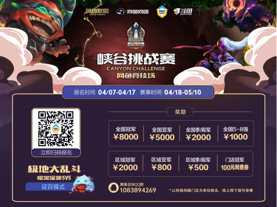 此外网鱼竞技场×英雄联盟峡谷挑战赛开放报名,总奖池38万!大乱斗模式率先开场,线上+线下同步开赛。网鱼网咖联手英雄联盟官方,共同解锁全民电竞新姿势。参与网鱼竞技场并获得全国前8名的队伍,也有机会获得斗鱼官方签约等额外资源。