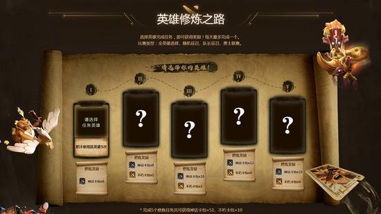 英雄试炼不仅在于完成全英雄成就,更要在游戏中提升自己的游戏技艺。活动期间,英雄修炼之路也随之开启。点击活动页面的“开启修炼之路”,即可解锁任务。在英雄修炼之路上,玩家可以选择五个英雄参加活动,只要完成相应的任务要求,即可获得对应的奖励,完成5个修炼任务共可获得神话卡包×51、不朽卡包×10!任务类型均为游戏内的对局内容,提高英雄熟练度、增进游戏理解的同时,还能完成任务收集英雄卡牌,也是一件快事!