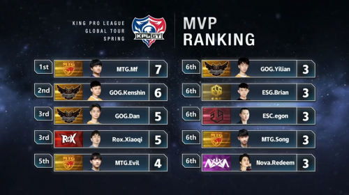 同样老牌强队GOG的状态也非常不错,除了在首周的比赛中2:3惜败给本赛季最强黑马MTG外,两周的比赛未尝一败,在最后一天的比赛中更是3:0兵不血刃拿下ESC收获本赛季的第五场胜利,在雪藏队内大腿北美第一边路MTC后占据榜单第二,同时队内的中路选手Kenshin更是在本场比赛中通过超秀的发挥,连续两次荣获单局MVP这也使得Kenshin在选手MVP榜单的排名第二仅次于MTG的MF。不仅如此在MVP榜单前十的位置GOG和MTG各占据三个席位,由此可以老牌强队GOG底蕴是多么的深厚!