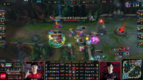 第一局比赛,JDGKanavi选出了打野豹女,利用豹女灵活高伤害的特点,JDG前期拿下了先锋和第一条小龙。12分钟JDG上路破掉一血塔,随后不断蚕食地图资源,16分钟JDG经济领先3K,但RW始终很克制自己,双方一直没有人头产生。直到17分钟RW佐伊E中泰坦才收下一血!22分火龙团战,JDG先行拿下小龙但被RW堵在了龙坑,被迫接战打出了3换4,小赚不亏。26分JDG大龙逼团,Zoom腕豪大招砸中JDG后排三人,大获全胜的同时收下大龙。32分钟RW佐伊POKE的时候被泰坦控住击杀,复活时间长达53S,JDG抓住机会直接一波推平了RW基地。