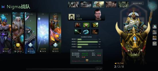 和VP一样,OG也没有以完整的阵容参加本次ESL——Topson和MidOne因故缺席,33和Ceb顶上了他们位置。不过在具体的比赛中,这样的说法其实稍显不妥,因为OG经常性地更改分路,33、Ceb和Sumail并没有固定的位置。而在小组赛的第一天,OG就为我们带来了大哥陈的好戏——33的优势路陈在三件团队装到手后准时发动推进,Nigma被OG一波铲平。虽然在最后一天,OG又叫来Madara替补Ceb,但他们还是拿到了胜者组的资格。