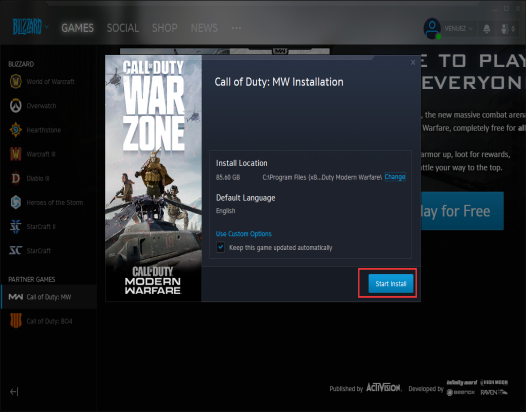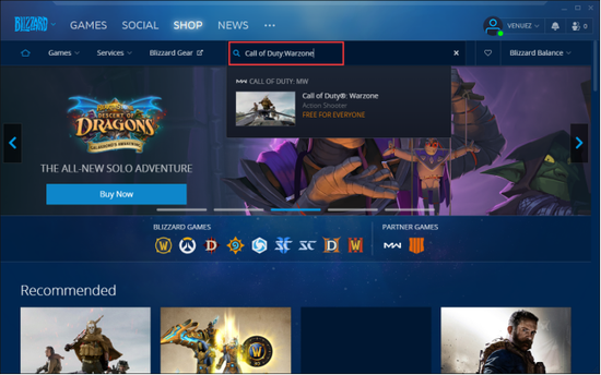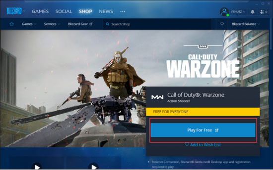 登录战网国际服客户端后,在“SHOP”界面搜索“Call of Duty:Warzone”,可找到该游戏: