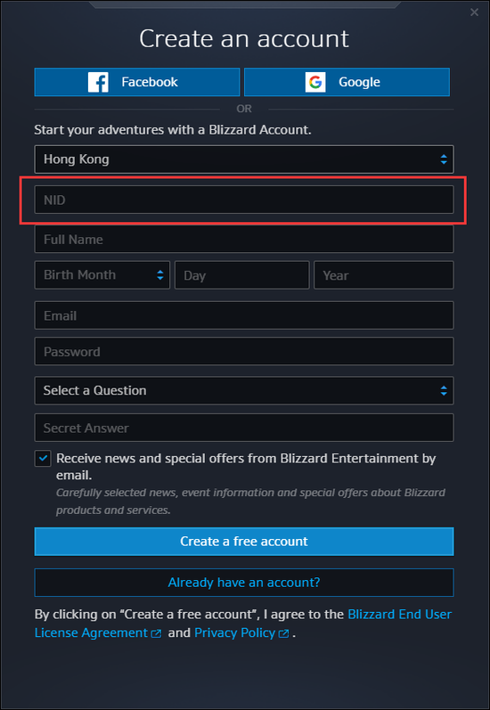 如果是注册香港地区ID,可以使用你本人的身份证(NID一栏填写身份证),注意:这里填写的注册邮箱不能和你国服用过的邮箱重合: