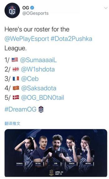 OG战队宣布了他们WePlay!Pushka联赛的参赛阵容。相比于ESL one洛杉矶线上赛,唯一的区别是由格鲁吉亚中单W1sh-替代33担任二号位。