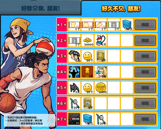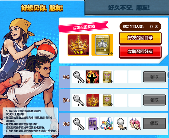 只能召回已经绑定手机并且离线90天以上的好友,被召回的好友完成1场比赛才算成功召回,每天最多能尝试召回5名好友,活动期间最多能成功召回30名好友,完成相应的目标可以领取相应的奖励,如果你能召回8位好友,就可以获得41级角色包以及永久发型。
