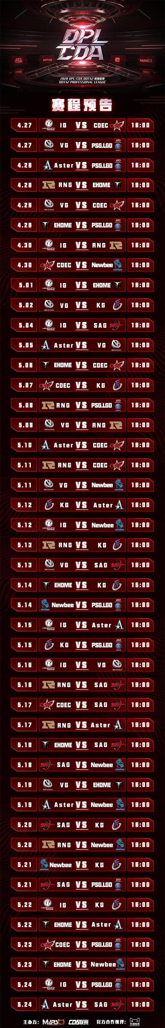 本次DPL-CDA主赛事的阶段采用单循环Bo3赛制,胜者积1分,负者积0分。同时记录BO3每一小局的胜负,根据队伍积分来确定最终排名。赛程为期28天。赛前选边也将迎来SOLO赛的精彩环节。明日的揭幕战将率先展开两场焦点对决。16:00,iG将率先迎战CDEC。IG在上届CDA赛事中几乎打满每场BO3,打法上相对沉稳,而CDEC刚刚从预选赛突出重围,状态火热。19:00将上演第二场焦点对抗,VG迎战PSG.LGD。作为在上届CDA赛事中小场次胜率和场均击杀次数最高的队伍,PSG.LGD不仅有着深厚英雄池,且全队默契配合再次达到了顶尖的水准。而VG这边也不容小觑,稳定的战术体系和强力的后期打法曾让很多队伍都铩羽而归。相信这场顶级较量会再次为大家带来值得回味的精彩。