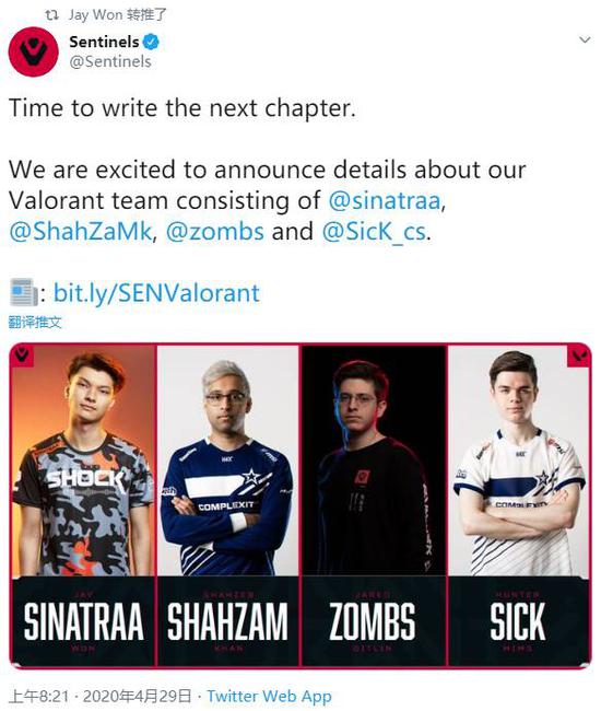 今天OWL旧金山震动队官推发文暗示Sinatraa选手离队,而后Sentinels官推发文确认Sinatraa加入旗下 Valorant 队伍。据Sentinels介绍,目前旗下 Valorant 队伍已有四名队员,分别为前 OW 职业玩家Jay “Sinatraa” Won、前 Apex英雄 职业玩家Jared “Zombs” Gitlin,以及两位前 CS:GO 玩家Shahzeb “ShahZaM” Khan和Hunter “SicK” Mims,Sentinels正在寻找第五名成员以完善 Valorant 战队。