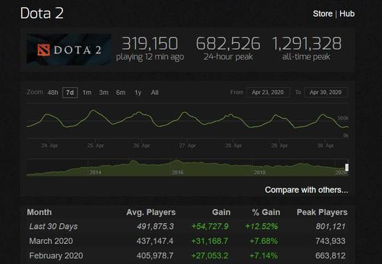 回看四月,V社发布了好几个不得人心的小补丁,对此中外论坛里都是哀嚎一片,整个DOTA2的未来也显得阴云密布。然而四月份的游戏在线人数却有明显的回升。在过去的三十天中,DOTA2的平均玩家数量到达了惊人的49万,比上个月竟然高出了12.52%! 而峰值更是达到了80万之高。