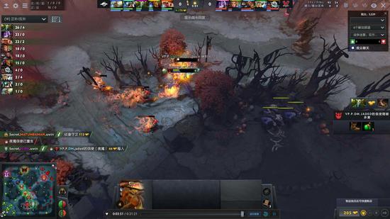 22分钟,VP.P开雾,斧王跳吼在野区抓到了先知,刚准备心满意足地撤退,蝙蝠跳拉击杀了紫猫,斧王和发条也被小牛留下,Secret趁机中路上高。等对方人快活了,Secret又回撤拿下了二代肉山,