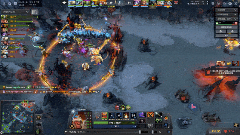 26分钟,Secret集合上路推进二塔。VP.P也全员防守。BKB龙骑顶在最前面,女王一个大招将对面打成残血,此时火猫入场收割。小骷髅没有保命装一秒躺,其队友也一个一个地倒下,Secret打了对方一波5人团灭。