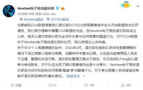 近期接到CDA联盟调查我们俱乐部DOTA2分部假赛事宜并在今天由联盟做出处罚通告,我们表示理解并尊重CDA联盟的决定。但Newbee电子竞技俱乐部自成立以来,绝无以俱乐部或分部为主体形式参与任何假赛和赌盘行为,对于CDA联盟关于Newbee电子竞技俱乐部的处罚,我们将提出上诉申请。