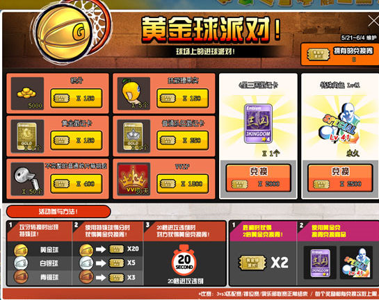 活动规则:攻守转换开球时概率出现特殊球。使用特殊球得分时获得黄金兑换券。持有黄金球,出现20秒违例时,对方获得黄金兑换券。胜利时获得两倍黄金兑换券。黄金兑换券可兑换活动商品。每个奖励都有兑换次数限制。3V3匹配赛/排位赛/俱乐部联赛中才会出现特殊球。