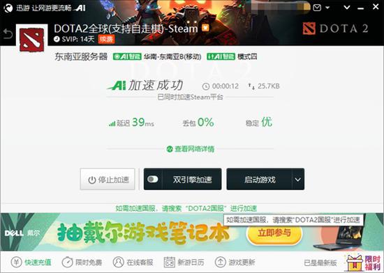 《Dota2》这款游戏陪伴了很多玩家的青春,本次新内容的上线也会吸引一大波玩家回归,大家在遇到延迟高和掉线问题的时候推荐使用迅游加速器进行加速。迅游加速器已支持《Dota2》游戏加速,迅游加速器采用军工级专线运输游戏数据,确保玩家们的游戏数据直达游戏服务器,不丢包不掉线,为玩家们流畅的游戏环境保驾护航。