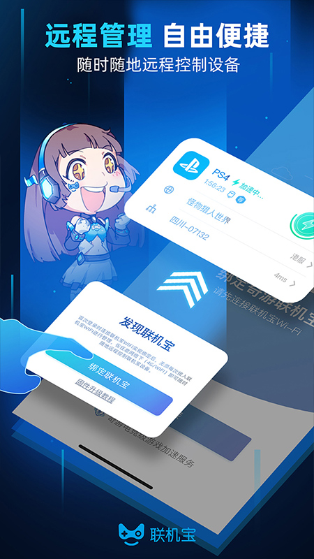 玩家在首次登录App时,通过手机连接到联机宝WiFi即可实现绑定。绑定后,玩家想要管理主机设备,无须每次接入联机宝WiFi,在任意网络下(4G/WiFi)、任何地点,都可随时随地远程控制联机宝设备,十分智能便捷。