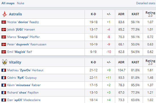 自替换掉队内核心大脑gla1ve后,Astralis的表现则一直处于低迷状态,尤其在进攻方的便秘让原本势如破竹的打法变得有些天差地别。在与Vitality对决的Nuke上,Astralis的进攻表现更像是个人实力的发挥,在开局ECO翻盘拿下3-4开局后Vitality强悍的枪法便将单人摸排的Astralis队员逐一击破,RPK的残局也的表现的天衣无缝。上半场仅取5分的Astralis又输掉了与shox的1v2残局,不在同一水平线的枪法与状态让Vitality轻松以16-6大败Astralis。