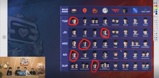 接着,四位解说嘉宾又一同评定了小组赛中的最佳阵容,他们分别是Zoom,Ning,Knight,Loken,Crisp。要说本次的最佳阵容里最为亮眼的,无疑就是打野位置的Ning王。在小组赛的比赛中,IG三战全败,未能够小组出线,但是Ning王的表现确实是非常亮眼。在几波团战中,Ning王多次用瞎子极限操作回旋踢,帮助IG搬回比赛的劣势。因此,Ning王的表现完全配得上最佳阵容打野的称号。
