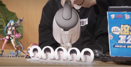 最后,来看一下四位嘉宾解说对于比赛的分析。在每局比赛结束之后,电棍都会在失败方的某位队员照片后,倒上一杯开水。这杯开水放在背锅王后面的意思也很明显,就是在调侃这位选手为“铁沸物”。例如,在JDG输给FPX之后,电棍直接把开水倒在了Yagao和Kanavi这两位选手照片的背后。其实这也并不奇怪,在对战FPX的比赛中,Kanavi和Yagao的表现实在是有点过于低迷。尤其是Kanavi选手,他完全没能打出春季赛超神一般的感觉。因此,电棍这杯开水倒完之后,也得到了其他三位嘉宾的赞同。