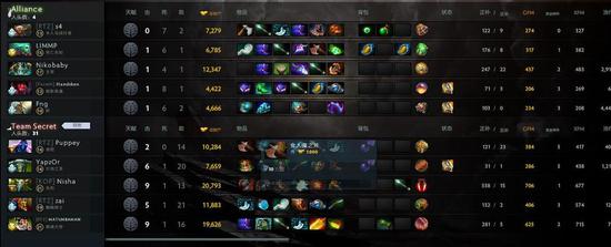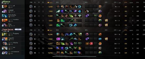 10分钟,Secret入侵Alliance野区,击杀兽王和Bane,米波占据经济榜单榜首。11分钟兽王再次阵亡,被船长和拉比克击杀,随后紫猫赶到收走残血拉比克,米波过来收掉Bane。