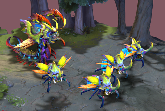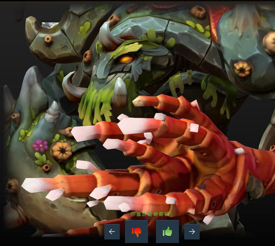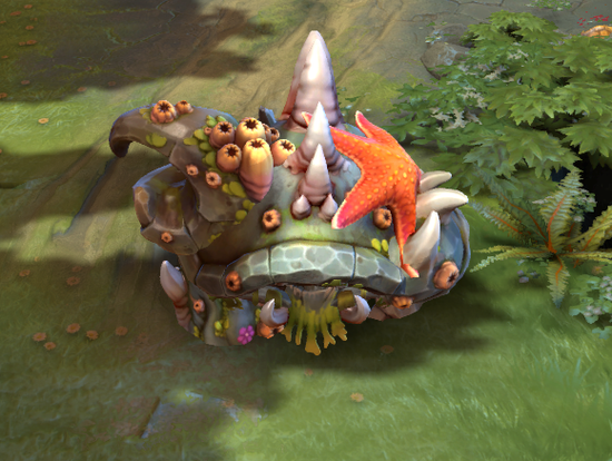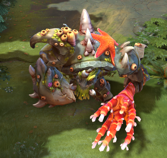 小小套装:海洋风格的小小套装,初始没学长大的时候,看上去和寄居蟹一样,整个英雄被硬壳包裹着,拔树之后会举起一捧红色珊瑚,与灰白色的模型反差极大。