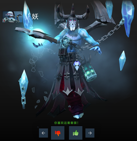 巫妖套装:手捧书籍,里面记录着各种邪恶的寒冰魔法,背部的锁链是当年被扔进湖泊时封锁住其魔力的绳索。让巫妖这个小辅助充满王霸之气的一套饰品。