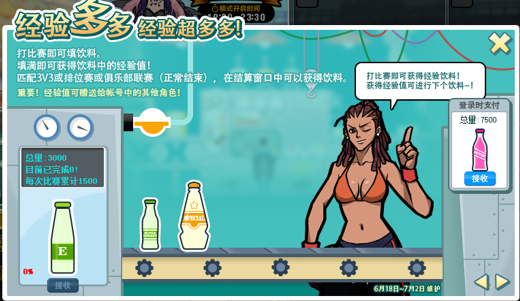 6月18日服务器维护后---7月2日服务器维护前,玩家打比赛即可填装饮料。填满即可获得饮料中的经验值。填满一个饮料瓶接收经验后可以填装下一个饮料瓶。每日上午8点—凌晨1点,完成匹配3V3/排位赛/俱乐部联赛,在比赛结算窗口可以获得饮料,经验值可以赠送给账号内其它角色。