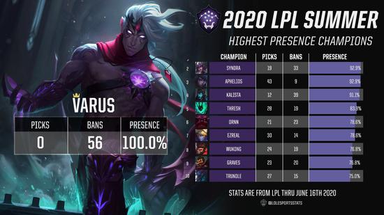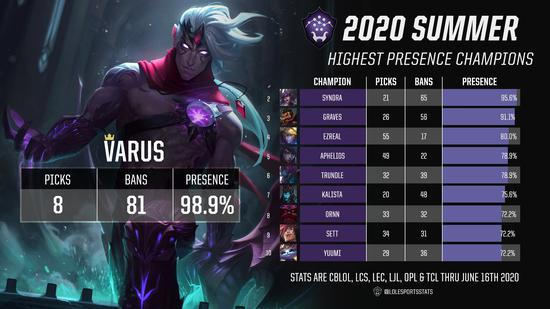 而在除了LPL以外的各个赛区(不包括还未开赛的LCK),韦鲁斯也是同样OP,达到98.9%的BP率