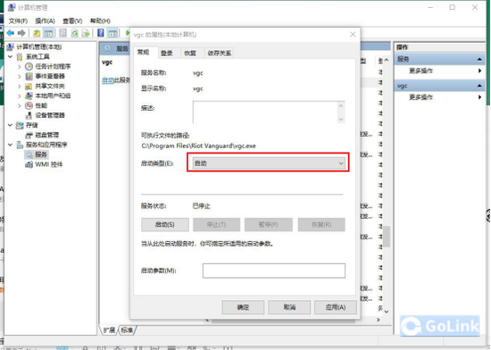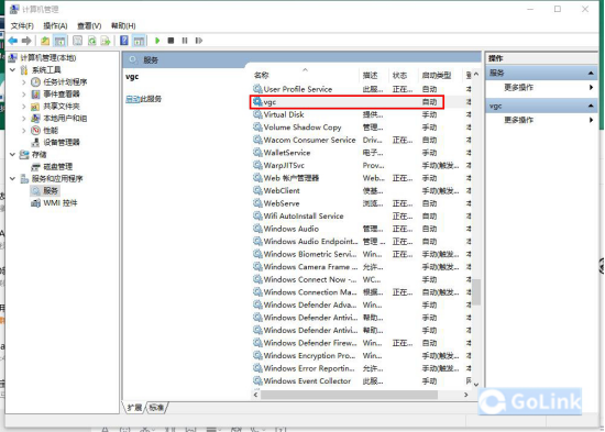 2、在桌面中右击我的电脑,选择管理,进入计算机管理菜单,在这个菜单的服务和应用程序下拉列表中,双击服务,在右侧展开所有的服务项,然后找到vgc服务(简单方法就是在右侧服务项中随便点击一项,然后按键盘上的V键,就会自动移动到V开头的服务项中,再找),双击vgc,在打开的窗口启动类型下拉框中选择自动,应用,确定。