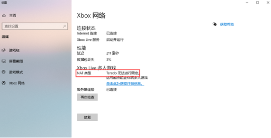 确保Xbox网络NAT类型开放,查询方法为:电脑搜索“Xbox Live 设置”,查询网络状态: