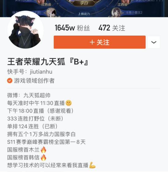 快手的九天狐,作为一个游戏主播是当之无愧的平台一哥,目前粉丝数已经达到了1600多w。就单从粉丝来说,没有多少主播能够超过他。九天狐主要还是作为技术早崛起的游戏主播之一,不得不说九天狐的人气非常高,作为国服最强李白的他向来以技术著称,虽然前期直播一直没有露脸,但却凭借着实力圈粉无数。