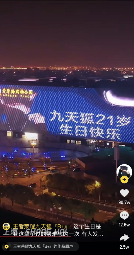 在生日的前一天,粉丝们还为九天狐发了一段编辑过的视频。在视频中,粉丝们“挤满”上海、长沙、江苏等地的标志性建筑,并在建筑上向九天狐表达生日祝福。据了解,这些都是在九天狐不知情的情况下安排的。九天狐将粉丝自制的生日视频更新置顶,表达对粉丝们的感谢。目前,该视频的点赞量就达到了90w+,12.6w的评论以及2.5w的分享,这个数据都是真实可见的,九天狐的影响力确实非常大,人气超高。