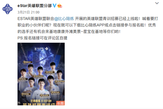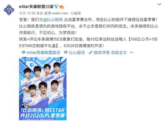6月18日,ESTAR战队官宣与比心陪练夏季赛继续合作,比心陪练将陪ESTAR共战2020LPL夏季赛。