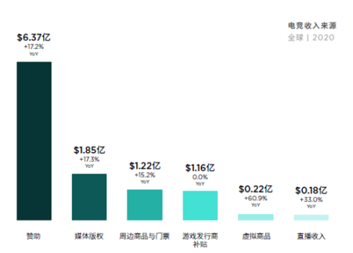 NewZoo 2020年全球电竞报告数据显示,在今年将产生的11亿美元电竞收入中,有6.37亿美元来自赞助,同比增长17.2%,占据了电竞总收入57.9%的超高份额。赞助商对俱乐部资金上的支持,可以帮助战队补充更充足的人力、实现更好的训练环境,也成为电竞行业不断发展的重要助力。