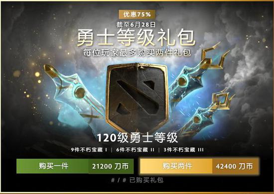 勇士等级礼包售价21200刀币,每位玩家限购两次。购买后可提升勇士令状120级,并获得9件不朽宝藏Ⅰ、6件不朽宝藏Ⅱ和3件不朽宝藏Ⅲ,折合等级和宝藏的价值优惠力度达到了75%,并且所有销售额的25%将直接进入第10届国际邀请赛的总奖金。