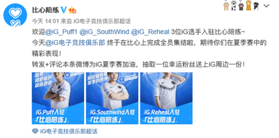 iG战队AD选手PUFF、辅助选手南风和Reheal今日官宣正式入驻比心陪练。