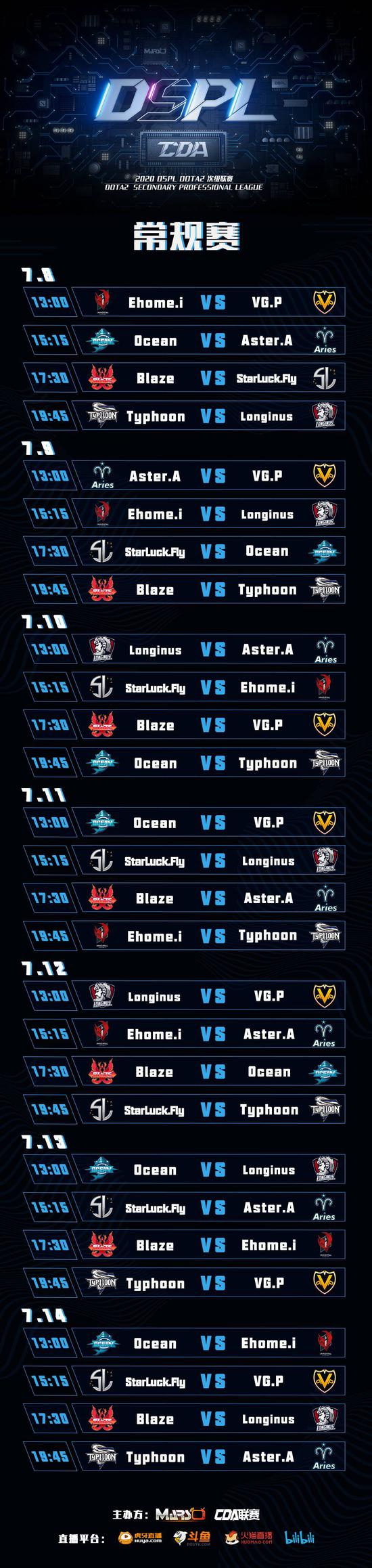 由Mars耀宇传媒主办的DSPL S2(DOTA2 Secondary Professional League S2,以下简称DSPL S2)中国DOTA2次级联赛将在7月8日(周三)再次拉开序幕。本次DSPL S2依然分为常规赛和季后赛两个阶段,参赛战队为:Ocean、Blaze、StarLuck.Fly、Typhoon、Longinus、EHOME.i、Aster.A以及VG.P(排名不分先后)。具体赛程安排如下: