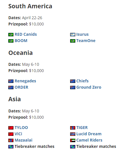 因此,第一个RMR赛事的奖金总额也发生了些许变化,欧洲现在共计11.5万美元,而北美的奖金总额为6万美元。与此同时,ESL透露了几乎所有其他地区的参赛队伍,Orgless和Yeah参加了北美区的比赛,Isurus和Team One加入南美区争夺,Chiefs和Ground Zero是在大洋洲的参赛队伍,而Camel Riders也是加入亚洲区赛事。