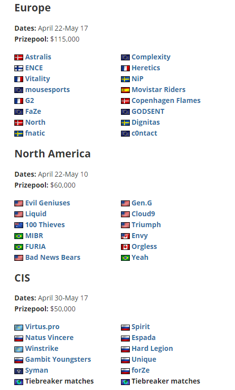 主办方主要根据队伍在Minor封闭预选赛的成绩来决定他们的席位。由于CIS地区和亚洲的多支队伍在Minor封闭预选中取得相同名次,ESL将举行决胜局比赛以确定这两个地区的最后两名参赛者。