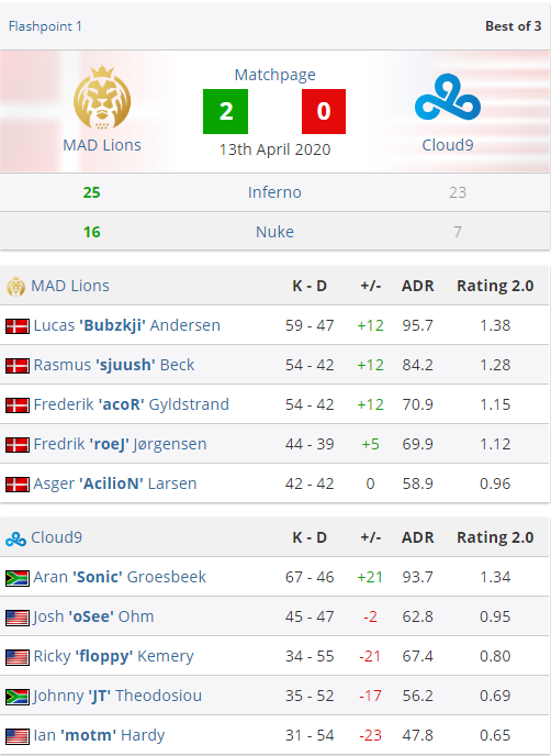 MAD Lions 2-0 Cloud9(Inferno 25-23;Nuke 16-7)
