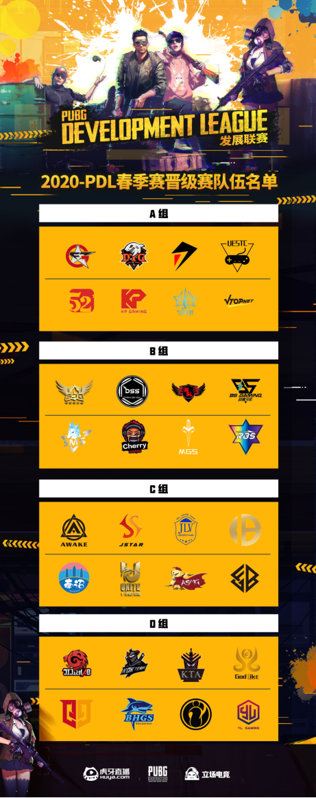 北京时间2020年4月13日,由PUBG主办,立场电竞承办,虎牙独家直播的PUBG官方赛事——2020绝地求生发展联赛春季赛(PUBG Development League,以下简称PDL)即将正式开打。在经历了一周的海选过后,共有32支战队进入到本次赛事中,一同向PCLP的名额发起争夺。