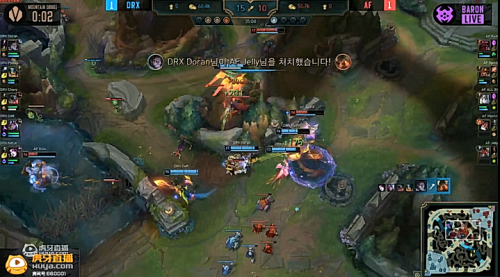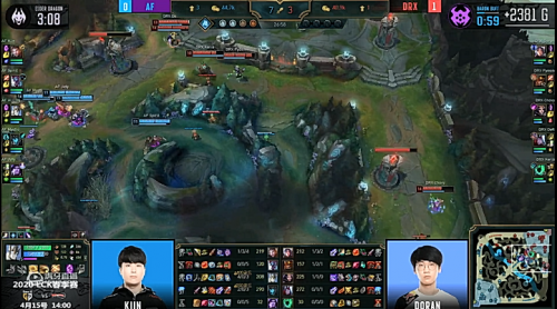 如果AF再输掉第二局,他们就将彻底失去进军季后赛的希望。所以在阵容的选择上,AF也选择了以稳健为主的体系,加里奥和宝石先后登场,将团战的容错率无限放大。而年轻的chovy则选出了前期节奏能力非常强的妖姬。这盘比赛的突破口发生在上路,doran的刀妹刚开始四分钟,就遭到加里奥的军训,率先交出一血,在传送上线之后,又吃到了第二波GANK,拱手让出塔皮。上路打的欢天喜地,下路也没闲着,巨魔抓住妖姬和皇子游走的空档期,直接rush掉火龙和土龙。