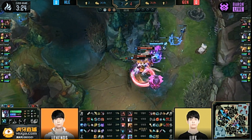 决胜局的较量本以为会更加激烈,但比赛却呈现了一边倒的局面。GEN选出了少见的巴德辅助,这个套路并没有收到太好的效果,反观HLE的辅助宝石,多次在团战中立下战功。他先是在第二条小龙的争夺中,丢出大招,保证队友的撤退,随后又在中路的团战里,规避了皇子的伤害。GEN在地图资源的运营上,显然有些丈二和尚摸不着头脑。仅仅23分钟就将水龙龙魂让给了HLE,拿到龙魂的HLE转身就在大龙坑处,送了GEN一个醍醐灌顶的一换三,在丢掉男爵后,GEN清线能力一般的弱点被无限放大,被迫开战的他们根本顶不住水龙魂的回血,再加上宝石的奶量本身就很高,HLE用一波干净利落的零换五,宣告比赛正式结束,这场气势如虹的让一追二,也让最后一轮的榜首争夺更加扑朔迷离。