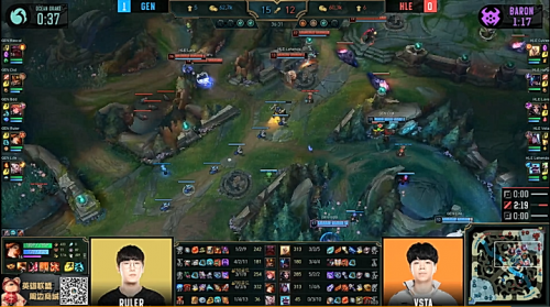 随着20分钟第三条小龙到手,HLE的优势已经很明显了,但是关键时刻clid和尺帝站了出来,他们手下的皇子和女枪实现了一波完美配合,纵使天使给到大招也无济于事,凭借一波一换五,GEN轻松拿下大龙。但是随着时间的推移,天使和维鲁斯的战斗能力越来越强,HLE在中路打出一换三后,仅剩两人的GEN无力守住基地,挖掘机最后关头点掉水晶,帮助HLE扳回一分。