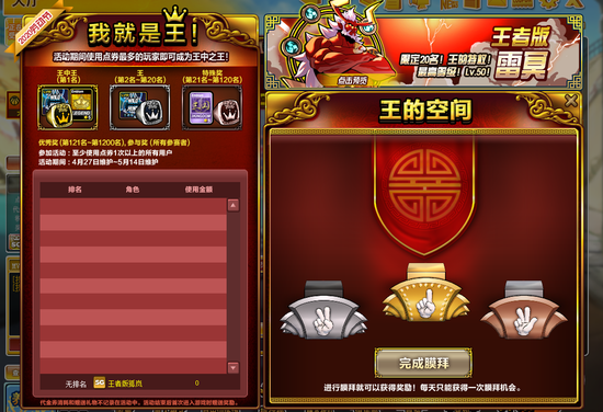 活动简介:活动期间使用点券最多的玩家成为王中之王!活动期间使用点券至少1次以上。赠送礼物和代金券的消费不计入我是王活动。活动结束后,前二十名可获得王者限定角色:王者版雷冥。