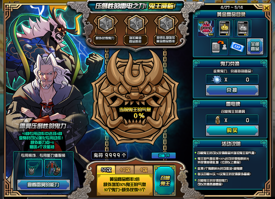 活动简介:玩家可在活动界面抽取道具。抽取道具时会获得“鬼力”个数,用于兑换道具。道具抽取有概率获得新角色:鬼王-雷冥、五星精锐队伍徽记卡等珍稀道具。